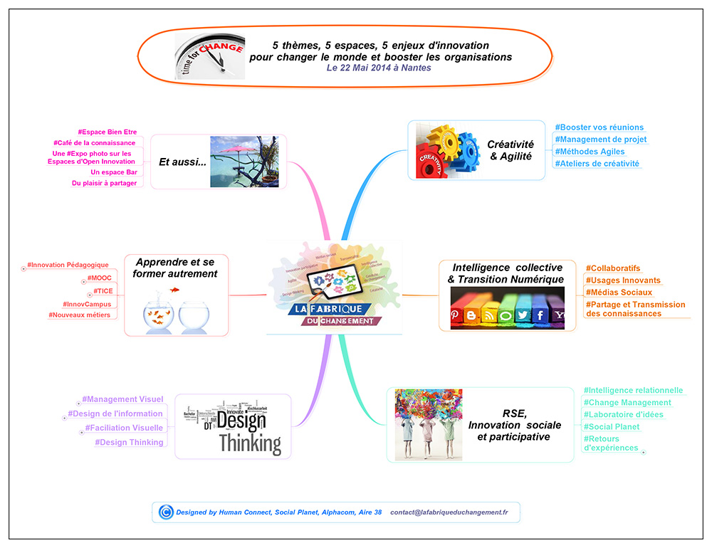 Le 22 mai 2014 avait lieu la première édition de la Fabrique du Changement, un événement basé professionnel atypique basé sur l'échange et la convivialité. On y a expérimenté l'intelligence collective, transition numérique, innovation sociale, RSE, design thinking et management visuel, bien-être au travail, créativité, agilité... Dans les locaux d'Aire 38, chantier de réinsertion sociale de l'île de Nantes, cet événement atypique réunissait plus de 150 professionnels intéressés par la conduite du changement.
